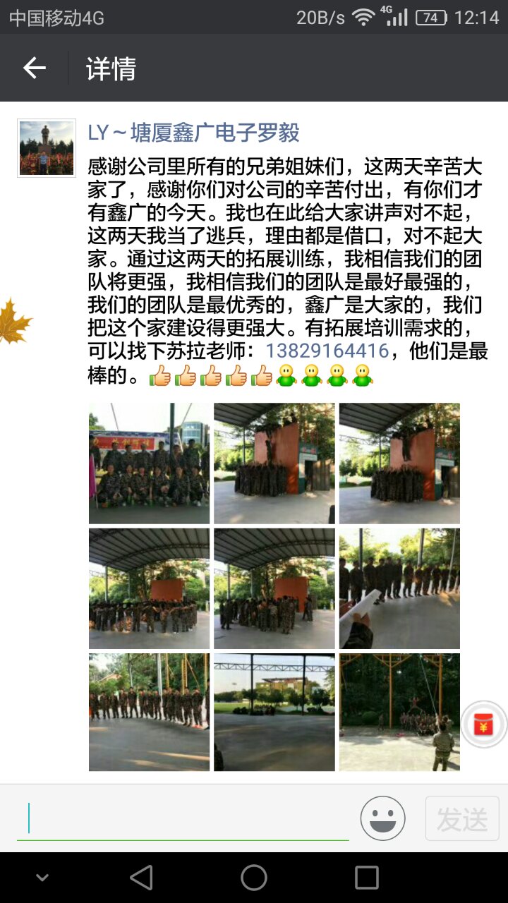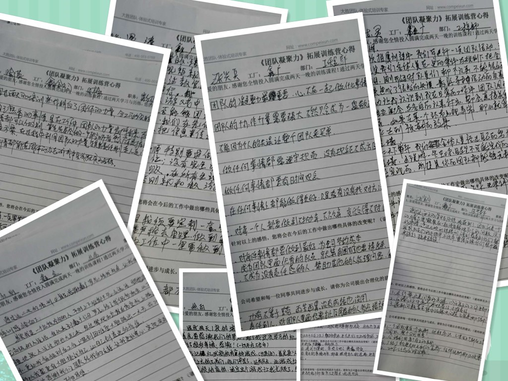 團隊訓練概況:熱烈祝賀鑫廣團隊兩天一晚的團隊凝聚力訓練取得圓滿成功!此次鑫廣團隊共派出管理干部及辦公室職員51人參加團隊訓練,在大勝團隊教練精心的安排及主導下,學員們深切的感受到了一個卓越高效的團隊的形成與每個成員的努力和付出是密不可分的,作為一個部門或班組的管理者,應當以身作則去影響團隊,帶領團隊,克服困難,保質保量的去完成工作目標。在訓練中大家放下職務與年齡,敞開心扉,開誠布公的交心交流,過往工作中的摩擦、芥蒂在愉快的氛圍中煙消云散,團隊進一步得到了凝聚和提升。在兩天一晚團隊訓練結營時,羅總購買了大量的水果犒勞學員和教練。對大家訓練的收獲感到欣喜,并給出肯定與期望。祝愿鑫廣團隊越來越好!